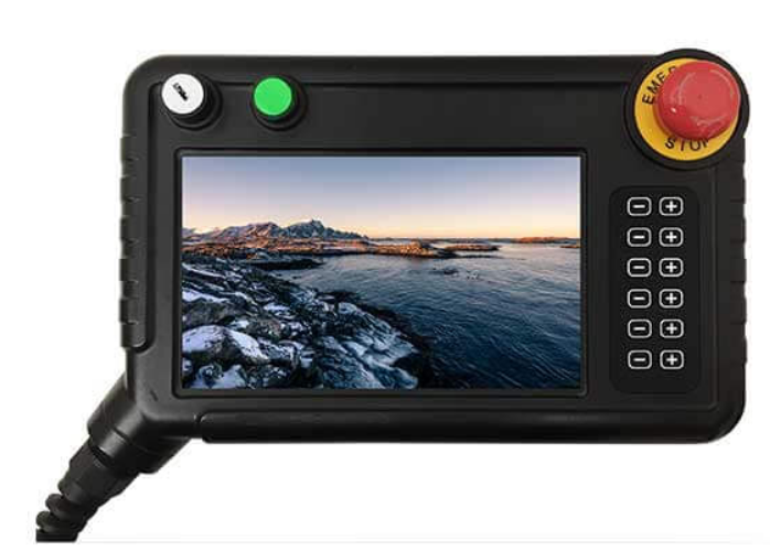 按鈕一個三段位安規(guī)使能開關(guān),一個鑰匙開關(guān);一個帶燈自鎖開關(guān),一個安規(guī)急停開關(guān)
